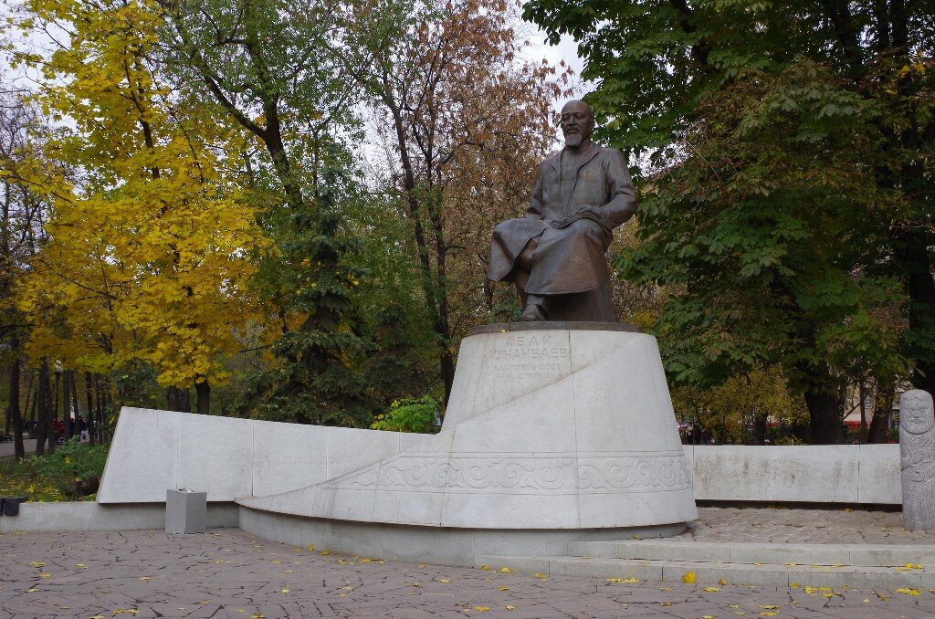 Из серии "Бульварное кольцо" Памятник был установлен в 2006 г. в рамках двухсторонних культурных обменов Россия – Казахстан. 2006 г. был годом Абая в России, а в Казахстане отмечали год Пушкина. Абай Кунанбаев (1845 – 1904) - Казахский просветитель, поэт, основоположник письменной литературы, человек, заложивший основы сближения национальной культуры с западной, русской на основе просвещённого ислама. Он переводил Пушкина, Лермонтова, Крылова , выступал за прогрессивные взгляды на жизнь, в частности рабского положения женщин и т.п. Вот строка из его стиха, говорящая о его мировоззрении - «Бестолково учась, я жизнь прозевал». Самым знаменитым его произведением является поэма «Простое слово» - 45 кратких притч, в которых поднимаются разные проблемы жизни. Родился Абай в богатой семье бая, знатного племени. В детстве его назвали Ибрагимом, но бабушка дала ему прозвище «Абай» (вдумчивый, внимательный, осторожный), которое и закрепилось за ним на всю жизнь. Образование сначала получа
