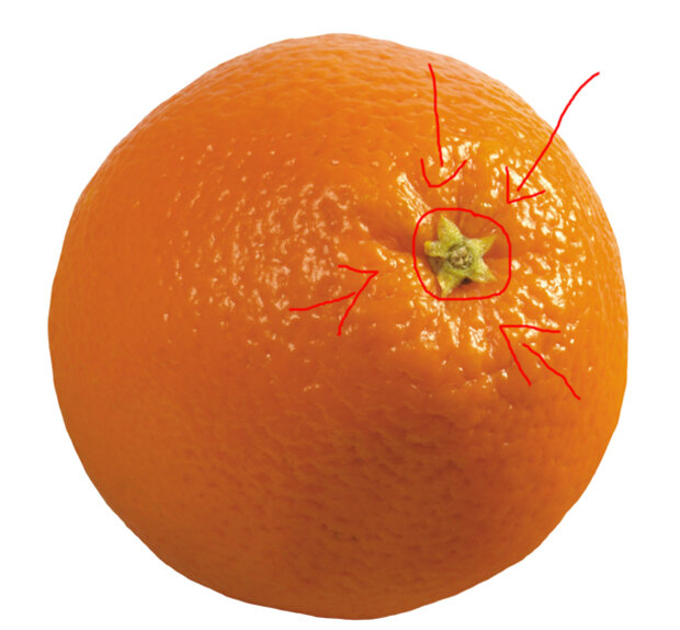 Как узнать сколько долек в апельсине, мандарине или лимоне до того, как его почистить? Оторвите вот эту штучку, которая на картинке: Под ней есть малюсенькие дырочки. Сколько дырочек - столько и долек. Через отверстия апельсин впитывает соки в дольки, когда растёт.