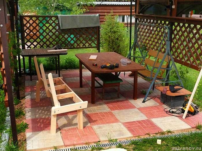 Стандартный навес из поликарбоната смотрится сиротливо, неважно, для чего он будет использоваться. Будет ли это гараж, беседка, просто рабочее место с защитой от дождя, сразу появляется желание его облагообразить. Для лучшей защиты от косого дождя, хочется закрыть фронтоны и обозначить функциональные стены. Если при сборке навеса это было предусмотрено, как я писал тут, то проблем с оформлением навеса не возникнет. Конечно, все эти дополнения в базовую комплектацию могут быть внесены и позже, но трудозатрат будет больше. Вот пример преобразования навеса в беседку: Вот пример использования навеса для парковки автомобиля, это не гараж, но зимой машину практически не приходится чистить от снега: В зависимости от того, как будет использоваться навес, его основание может быть различным. Например, для беседки мы выбрали вариант выравнивания площадки за счет подсыпки песка/отсева (отсев для этих целей лучше) и укладки плитки. Под автомобиль также желательна твердая основа. Песок и отсев при