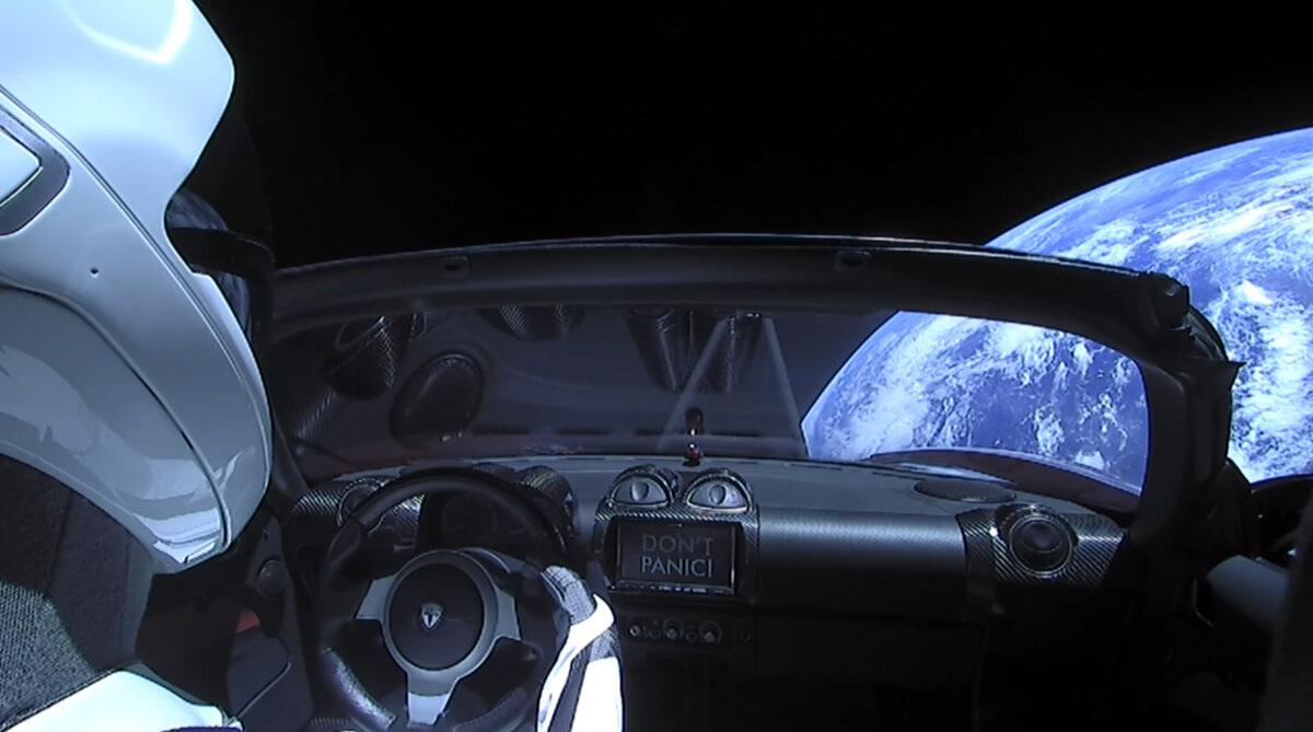 6 февраля в 23:45 по московскому времени с космодрома на мысе Канаверал компания Space X, принадлежащая Илону Маску, впервые запустила сверхтяжёлую ракету Falcon Heavy. Два вспомогательных ускорителя ракеты удалось посадить обратно на Землю, основной же разбился при посадке на платформу в океане - но и это уже является большим успехом. А вместо банальных бетонных или железных блоков в роли полезной нагрузки Falcon доставила в открытый космос личный спорткар Илона Маска Tesla Roadster, с открытым верхом и манекеном, одетым в скафандр. В компании Space X манекену дали имя Starman, в честь песни Дэвида Боуи, а если верить Маску, то стереосистема в Тесле по кругу играет другой трек Боуи - "Space Oddity". Ещё одна важная деталь - на экране бортового компьютера светится надпись "Don't panic" из цикла романов английского фантаста Дугласа Адамса. Автомобиль направится к поясу астероидов между Марсом и Юпитером. С нескольких камер на борту Теслы велась видеотрансляция на YouTube, которая длил
