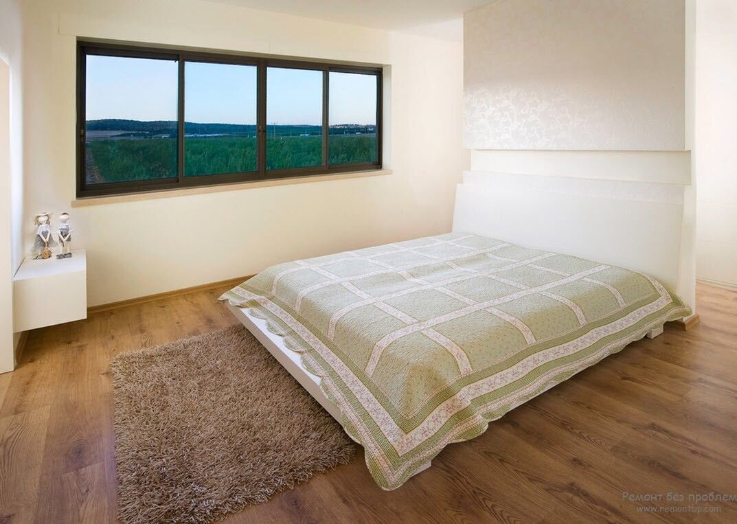 Кровать также может находиться на стационарном подиуме, оборудованном системой хранения. Главное, следует помнить, что отличие спальни минималистского стиля заключается в низкой кровати без полога, без изголовья и балдахина с простыми тумбами с двух сторон.