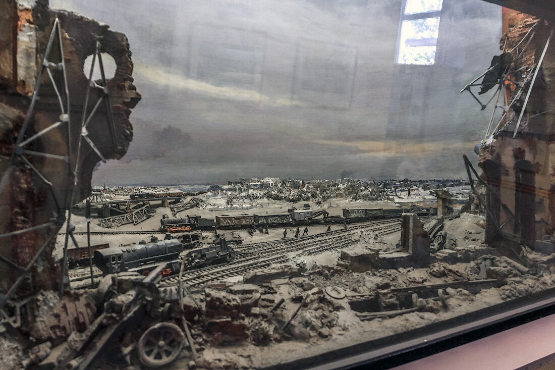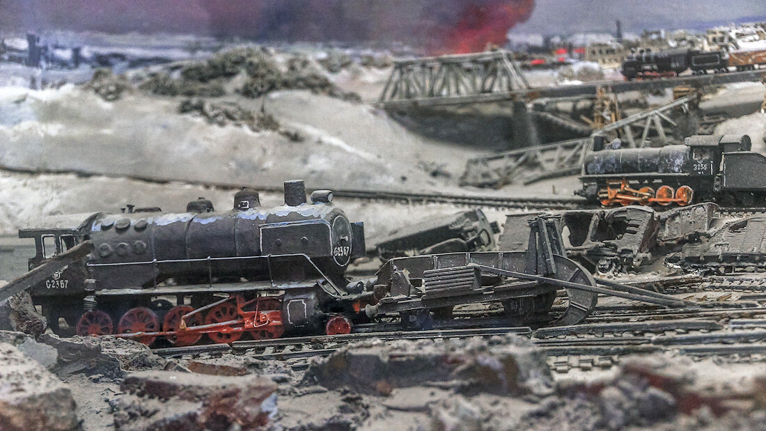 Немецкий путеразрушитель системы «крюк». За время войны было разрушено 65 тысяч километров железнодорожных путей, более 13 тысяч искусственных сооружений, более 4 тысяч станций. Новые линии прокладывали со скоростью 16 км за день. Восстановлено было 115 тысяч километров железных дорог (некоторые дороги восстанавливались по два-три раза).