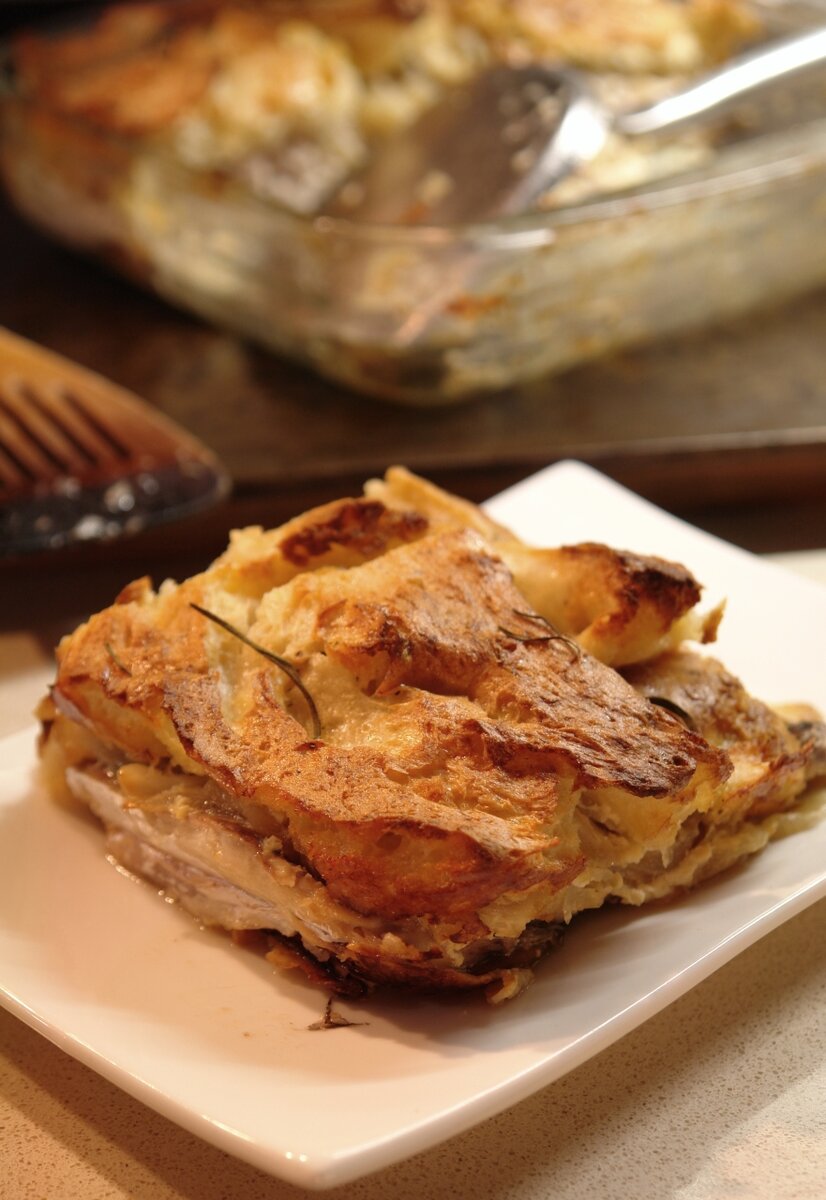 - пассерованный лук; Кусочки лепёшки-лаваша окунуть в смесь яйца и молока и выложить поверх лука как черепицу. Постараться выложить так, чтобы не было зазоров. Остаток яичной смеси вылить в форму. Запекать при 180 градусах около 30 минут.