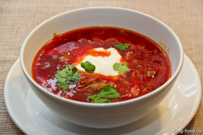 Добрый день! Многие знают Марата Абдуллаева (он же Дундук-Кулинар) и читают его блог. Шикарные рецепты, прекрасные книги, интересный человек, а уж его рассказ про ферганский плов — вообще ода узбекской кухне! Но я никогда не обращал внимания на его роскошные рецепты супов. И не только восточного и среднеазиатского происхождения, а что ни на есть классику русско-украинской кухни — борщи. Вариантов у него несколько, но один мне приглянулся в силу решения, которое позволяет сохранить цвет свеклы и придать борщу ту красноту и яркость, которая так украшает это кулинарное произведение. И действительно, сколько ни делаешь — постоянно всё сваливается в помидорно-оранжевую гамму. А тут не просто очень вкусно получается (я вообще до этого таких борщей не едал), но и потрясающе по цвету. Каюсь, я немного отошёл от оригинала, поскольку хороших помидоров в это время года у нас не наблюдается и сладкий перец с петрушкой заменил сушёными аналогами, но всё равно получилось очень вкусно: Продуктовый на