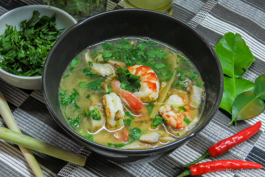 Добрый день! Вот же чудеса терминологии )). С удивлением узнал, что суп «Том Ям» делается без кокосового молока, а тот, что с кокосом называется «Том Ка» (Tom Kha)! Пара слов об ингредиентах. Всё сейчас можно купить в крупных и средних супермаркетах. Набор выглядит примерно так и в него, помимо всего, входит один абсолютно незаменимый компонент — лемонграсс или лимонное сорго. Если галангал можно заменить имбирём, а листья каффир-лайма — цедрой обычного лайма, то эта травушка имеет такой интересный вкус и аромат, что знатоки настоятельно рекомендуют использовать именно её. Второй обязательный ингредиент — рыбный соус, который тоже сейчас купить не проблема и в целом, совершенно бюджетно. Так вот это — наиобязательнейший элемент том ям. Без него вкус вообще не тот. И хотя некоторые утверждают, что его можно заменить соевым соусом, не верьте — суп получается совершенно иным. Ладно, хватит слов, перейдём к делу. Продукты (тут используется половина вышеупомянутого набора для том ям): Если