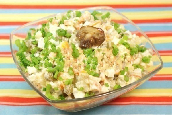 А вы когда-нибудь пробовали видоизменять классический оливье? Я до недавнего времени даже не представляла, что может из этого получиться. На Новый год делала с красной рыбой, а недавно попробовала с шампиньонами. Рецепт меня покорил. Может потому, что я большая поклонница грибов, но получилось действительно вкусно. Вот хочу и с вами поделиться, глядишь и вы решите отойти от классики) Понадобится: 2 картофелины 2 моркови 2 солёных огурца 200 грамм шампиньонов 2 яйца 100 грамм зелёного горошка зелёный лук майонез или сметана (на вкус) соль чёрный перец раст. масло Приготовление: Картофель, морковь и яйца отварить, остудить. Всё почистить и нарезать небольшими кубиками. Солёные огурцы также порезать кубиками. Шампиньоны мелко порезать и обжарить на растительном масле до готовности. Всё смешать в салатнике, добавить зелёный горошек, посолить и поперчить по вкусу. Заправить майонезом или сметаной, кто с чем больше любит. Сверху посыпать зелёным луком. Экспериментируйте, друзья, иногда это о