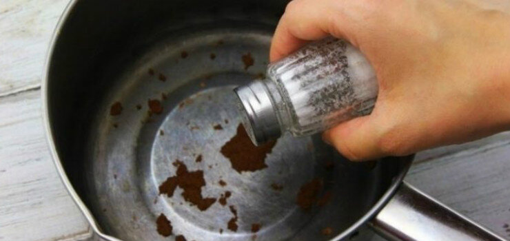 - Загрязненную железную посуду посыпают солью и оставляют ненадолго, потом моют, как обычно, и она сияет чистотой.