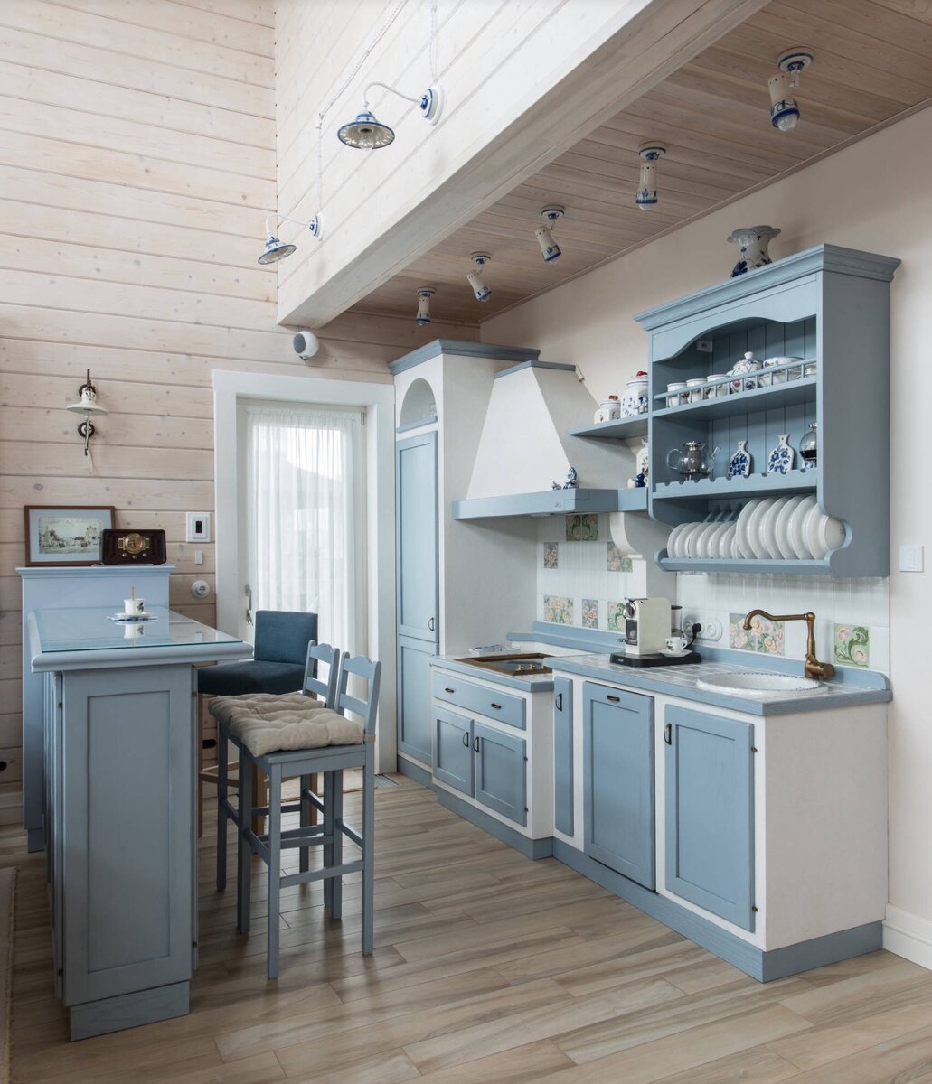 Каждый из нас мечтает о том, чтобы на кухне создавалась атмосфера комфорта. Стиль кантри поможет вам очутиться на бабушкиной даче, где в детстве постоянно стоял этот любимый запах вкусных пирожков. В этом стиле используются пастельные, нежные оттенки. Возможно их комбинирование. Важное положение уготовлено посуде, её должно быть видно, она должна радовать глаз. Приветствуется состаренная, фигуристая плитка для фартука. Плита и раковина должны выглядить не слишком современно. Обилие специй в красивых баночках, пышные зеленые растения в горшочках и разделочные доски будут являться украшением для кухни в стиле кантри. Светильники и табуреты должны быть железные, в ретро стиле. Особое внимание стоит уделить потолку и полу. Они должны быть выполнены деревом. Кантри стиль идеально подойдет для загородного дома, однако он наполнит уютом и небольшую квартиру. Выше представлен более роскошный вариант кухни в стиле кантри. Таким его делают именно фигуристые люстры над барной стойкой и обеденным