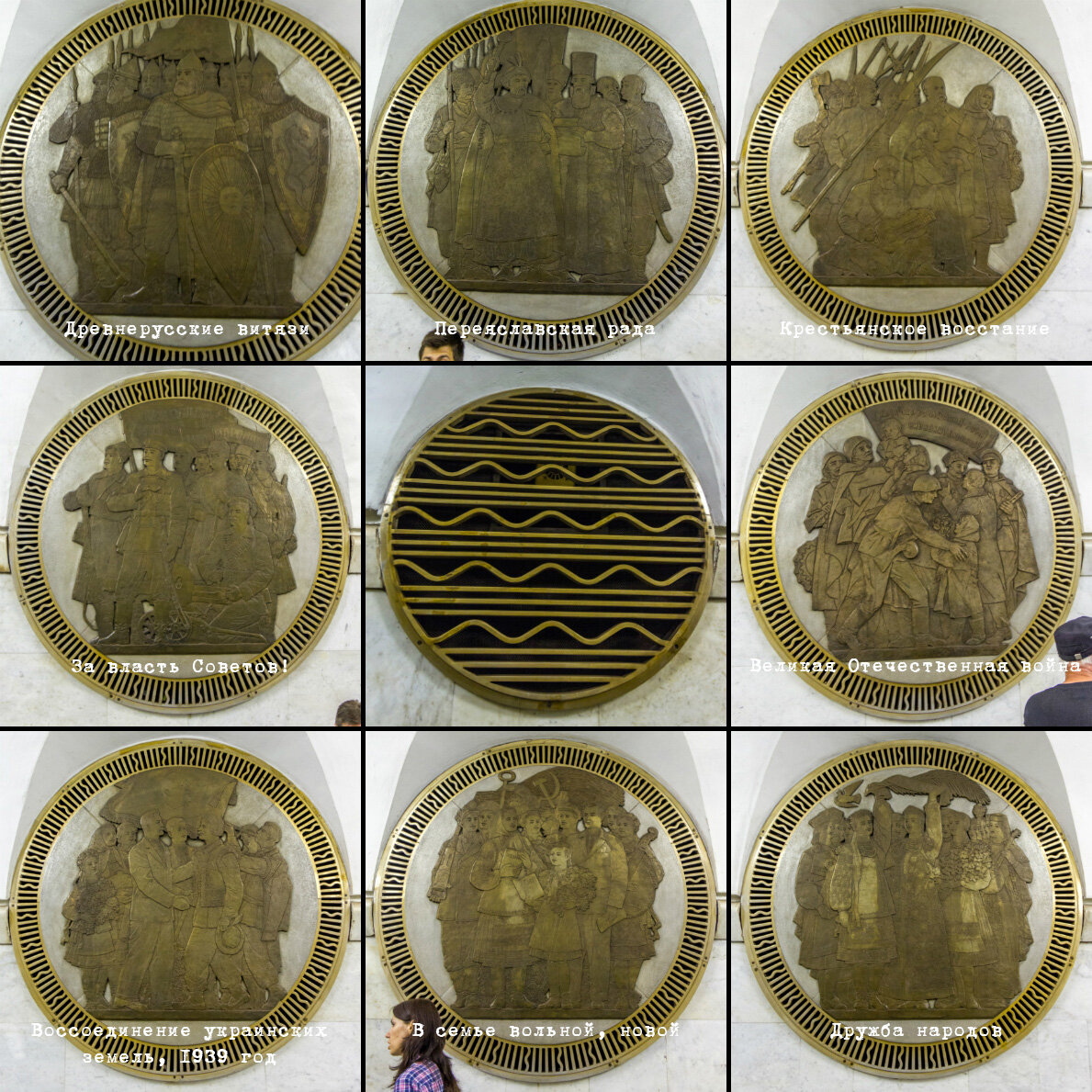 Пилоны центрального зала украшены бронзовыми чеканными медальонами диаметром до 2 метров, на которых изображены события из истории Украины. С противоположной стороны пилонов находятся решётки вентиляционных вытяжек.