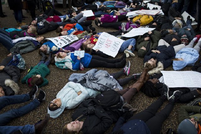 В Вашингтоне вчера студенты организовали протест у Белого дома, чтобы призвать Трампа к реформе закона об оружии в связи с недавним убийством во Флориде. И по этому случаю они притворились мёртвыми и лежали на земле, кто-то стоял с плакатами. Протестующие требуют от президента, чтобы он ужесточил контроль над оружием.