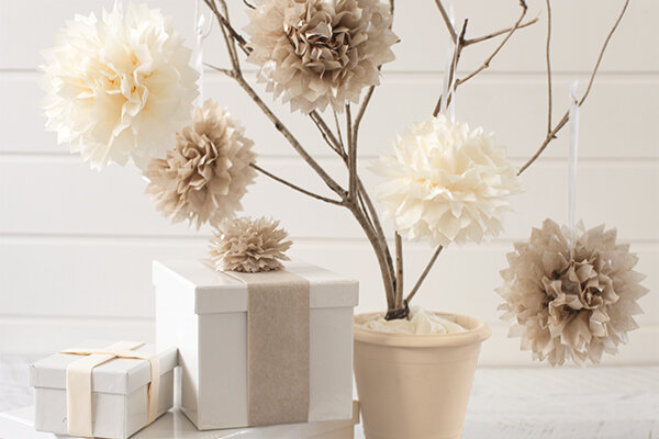Простые и одновременно очень необычные объёмные цветы-пушистики из салфеток или папирусной бумаги могут стать отличным украшением интерьера на день рождения или на свадьбу. Неоспоримый плюс такого хендмейда - простота исполнения и цветовые вариации. С такой работой справятся даже самые маленькие дети. Выберите в какой цветовой гамме будут ваши гвоздики, одуванчики, хризантемки, маргаритки и ... действуйте! Итак, нам понадобятся: Ножницы Бумага папирусная/ обёрточная/ салфетки Проволока Пассатижи или ножницы для резки проволоки Лента Пошаговая инструкция 1. В зависимости от желаемого размера нарезаем папирусную бумагу. На один цветок на фото уходит 8 листов размером 17х25 см. 2. Собираем все листы вместе и складываем гармошкой, края закругляем, либо заостряем концы, обрезаем пикой как на фото. 3. Отрезаем небольшой кусочек проволоки и обматываем им сложённую бумагу посередине. 4. Ленточку отрезаем и сшиваем. Это будет петелька-подвес. Прикладываем ленту к бумажной заготовке и закрепля