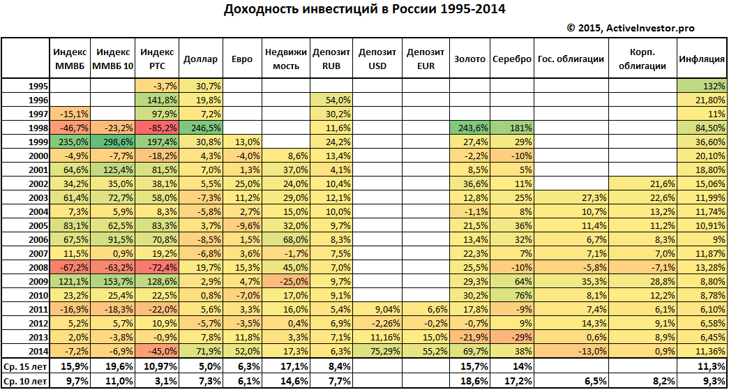 Многих инвесторов интересует вопрос, а куда выгоднее всего вкладывать деньги? Что лучше: акции или недвижимость, валюта или золото, депозиты или облигации? Какие активы показывали наибольшую доходность, в чем можно сохранить деньги от инфляции? Чтобы ответить на эти вопросы, нужно сравнить историческую доходность инвестиций в эти активы. В этой статье сравнивается доходность инвестиций в различные финансовые инструменты: акции, недвижимость, валюта, депозиты и облигации, драгоценные металлы. Но разве могут нам что-то сказать результаты доходности за какой-то один год? Для долгосрочного инвестора гораздо важнее результаты за несколько лет. Только так можно судить об эффективности тех или иных способов вложения денег. Поэтому сравниваем доходность инвестиций, начиная с 1997 года. Для сравнения были выбраны основные классы активов: Акции Облигации Деньги Недвижимость Драгоценные металлы Инфляция — годовая инфляция в России по данным Росстата Из таблицы видно, что за последние 15 л