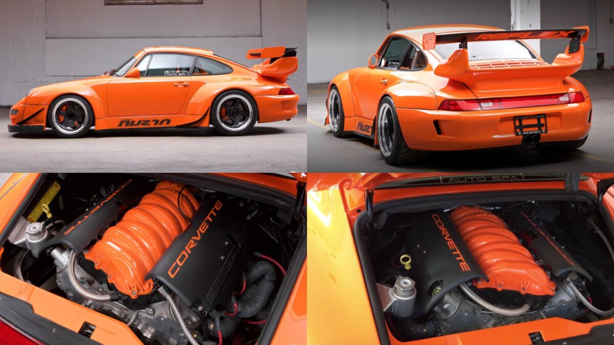 Помните пост о Porsche 911 c рядной турбированной четвёркой вместо 6-цилиндрового оппозита? Недавно появился ещё один забавный экземпляр, только в этот раз под капотом у него поселился здоровенный V8. Этот 911-й начал свою жизнь в 1995 году и был примерным Порше до недавнего времени — Carrera 2 в 993 кузове. Спустя 20 лет машина попала в руки… да кроме как «сатанистами» этих людей не назвать. Им было мало скорости и её решили добыть увеличением мощности. Дорабатывать штатный шестицилиндровый оппозитник? Нет, это было бы слишком тривиально, поэтому в моторный отсек втиснули V-образную восьмёрку LS1. Мотор объёмом 5,7 литра немного доработали, в числе прочего установив дроссель диаметром 102 мм и получили 475 атмосферных сил. Коробку передач на всякий случай заменили на агрегат от модели Turbo того же поколения. Львиную долю времени потратили не на установку мотора, а на приведение в порядок кузова и его последующее преображение. Для этого автомобиль полностью разобрали, провели пескостр