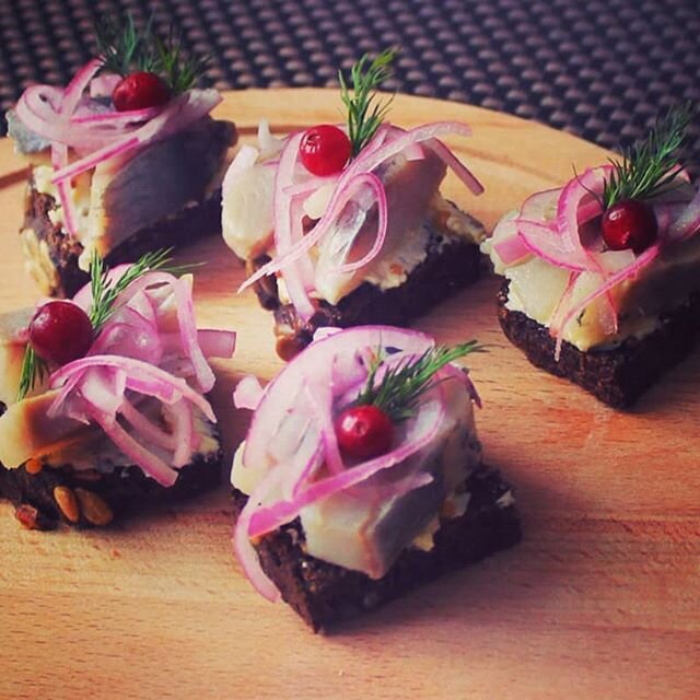 Собираем канапе: на хлеб мажем горчичную сметану, укладываем кусочек селёдки, сверху "шапка" из красного маринованного лука и украшение из укропа и ягод.