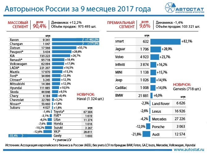 Российский авторынок продолжает расти – продажи в сентябре показали рост на 17,9% к результату годичной давности. При этом за 9 месяцев нынешнего года он вырос на 10,6%. Если рассматривать массовый сегмент, на долю которого по итогам января – сентября пришлось 90,4% от общего объема, то он тоже находится в «плюсе». Продажи здесь достигли 975,5 тыс. единиц (+12,2%). Среди представленных в ТОП-25 марок по объемам реализации в этом сегменте 18 демонстрируют положительную динамику. Лучше всего это удалось узбекскому Ravon, продажи которого выросли более чем в 15 раз. У китайского Changan – реализация увеличилась в 2,7 раза. У других брендов результаты «скромнее»: от +35,7% (Datsun) до +1,8% (Subaru и Nissan). Из тех массовых марок, которые по итогам 9 месяцев оказались в «минусе», наиболее критичная ситуация у Geely (-55,4%). У японского Suzuki и отечественного УАЗа падение превысило 10%, у остальных компаний этот показатель меньше. Продажи в премиум-сегменте за отчетный период снизились