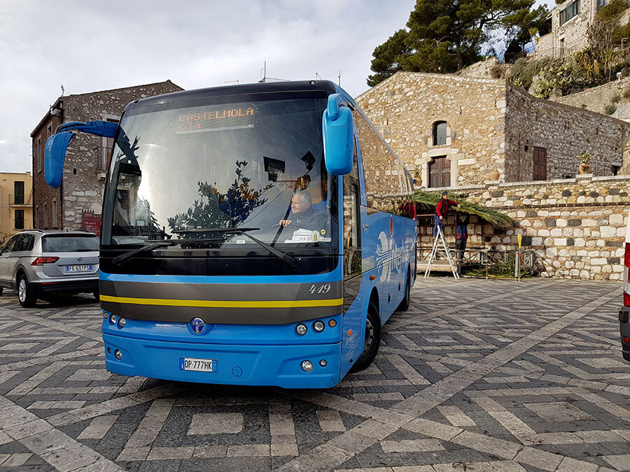 Для начала пара слов про автобус. Вот этот, например, ходит между городом Таормина, про который я рассказываю, и Кастельмола. Кастельмола - город на горе, и туда мы отправились, чтобы посмотреть, как там живут. Вот как раз на этом автобусе:)