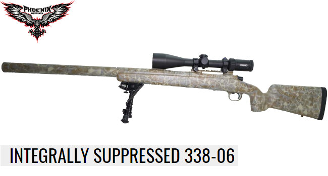 Компания Phoenix Weaponry, которая занимается производством и высококлассным тюнингом стрелковых систем, выпустила серийную охотничью винтовку ISHR в калибре 338-06 с интегрированной системой глушителя. Как влияет звук выстрела на стрелка, чем это опасно, и как защититься - мы писали об этом в более ранней статье. Новая винтовка Integrally Suppressed Hunting Rifle основана на качественно доработанном ресивере и затворе Remington 700, оснащена болтом затвора PTG облегченным формовкой, и тактическим увеличенным рычагом. По желанию могут быть использованы другие системы. Главная особенность оружия - это интегрированная система глушителя из 60,96 см внешнего корпуса Douglas на стволе с титановым сердечником и втулкой, для достижения максимально низкого веса и самой большой прочности, что на выходе даст рабочую винтовку, которую будет комфортно носить во время длительных переходов. Общий вес оружия в калибре .338-06 составляет менее 3,6 кг без установленной оптики. Для повышения точности с