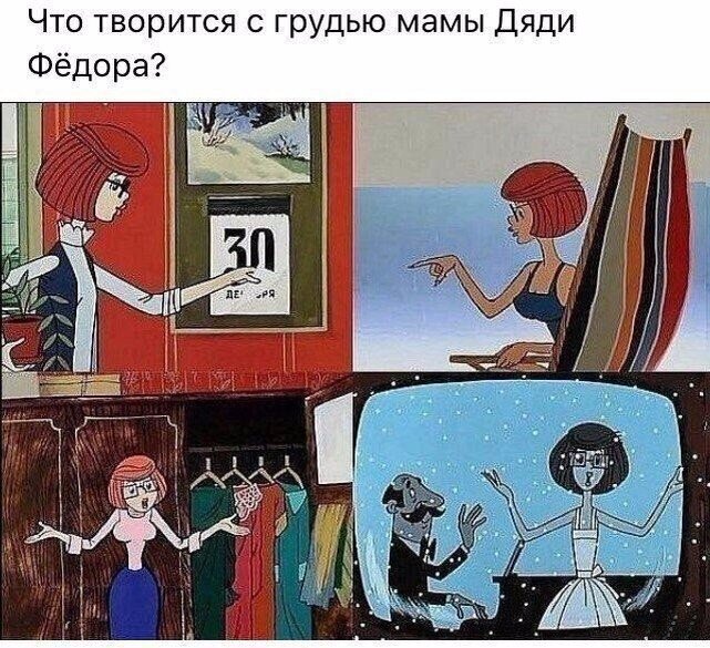 "В гостях у Простоквашино" - это советский мультфильм который по мнению наших юмористов, является советской Моной Лизой с зашифрованными знаками на героях мультфильма! Один из таких персонажей является Мама Дяди Федора у которой с грудью делалось что то явно не ладное на протяжении всего мультфильма, от начала и до конца! Мультипликационные эксперты " по кино ляпам" , утверждают нас ,что меняющийся размер декольте у персонажа мультфильма, говорит о том что каждый отрывок из мультфильма представляет собой некую осмысленность кризиса в то время и желание у женщин с опустошенными карманами, все таки хотевших каких то внешних изменений над собой! Например в 1978 году мало кто мог себе позволить увеличить грудь или губы, но мультфильм опередил события, показав что силикон возможен но без него лучше). Другие эксперты "по кино ляпам", объяснили это тем что художник хотел показать финансовые положения в стране в то время, не хватки чего то или наоборот, достатка и улучшение жизни вообще!