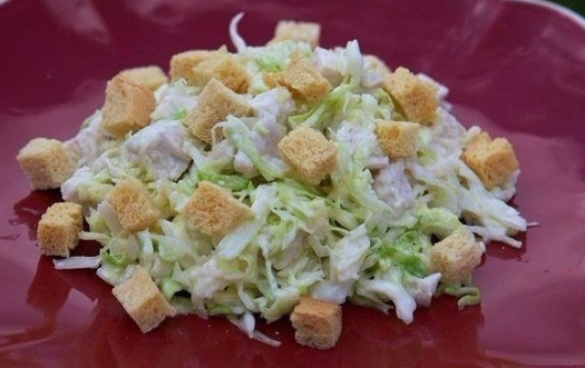 Этот вкусный, легкий и простой в приготовлении салатик, обязательно понравится своим пикантным вкусом и простотой приготовления! Ингредиенты 400 гр. куриного филе 150 гр. твердого сыра 400 гр. белокочанной капусты 100 гр. белого батона Майонез Соль и черный молотый перец по вкусу Приготовление Батон нарезаем маленькими квадратиками, посыплем солью и обжарим на капле растительного масла. Капусту нашинкуем посолим, помнем руками, чтобы дала сок. Курицу нарежем мелко и обжарим на растительном масле до готовности и золотистой корочки (можно просто отварить, а затем нарезать). Сыр натираем на треке, смешиваем с капустой и курицей, добавляем перец и перемешиваем. Перед подачей сверху выкладываем сухарики. Приятного аппетита!