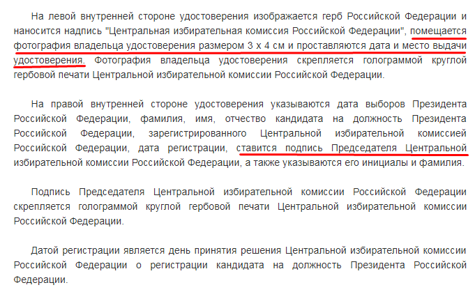 «6 февраля СМИ оповестили широкую публику, что удостоверение кандидата в президенты вручено Владимиру Путину. Однако тут же уточнили, что сам он для обязательной процедуры в ЦИК не явился. Однако, «удостоверение ему будет передано». А вот это, считают наши читатели, никуда не годится. Потому что закон не допускает заочное вручение удостоверений кандидатам в президенты — это раз. Во-вторых, сами они обязаны на глазах сотрудников ЦИКа лично расписаться в их получении. Разве не так, Элла Александровна? А как?» Читателям и писателям рекомендуем, прежде чем что-то утверждать, все-таки взглянуть на Федеральный закон от 10.01.2003 N 19-ФЗ «О выборах Президента Российской Федерации».