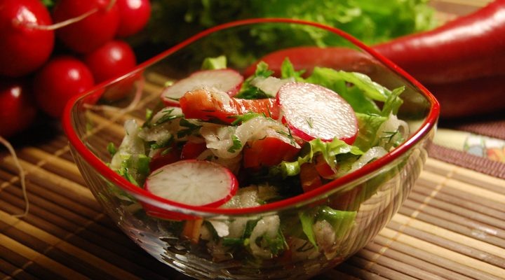 Основой такого салата будет обычная редиска (6-7 корнеплодов) и уже полюбившийся кулинарам дайкон (белая сладкая китайская редька, славящаяся максимумом полезных витаминов и микроэлементов). Второй вид редиса используется из расчета: половина редиса дайкон (можно брать и целый небольшой корнеплод) на все количество салата. Дополнительно вам понадобятся: • одна крупная розетка салата-латук,