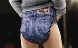 Потому неудивительно, что фирма Huggies, выпускающая подгузники, не так давно (в 2010 году, фото выше из статьи по ссылке) выпустила свой товар особой расцветки: цвета джинсов. Подгузники выглядят, как настоящие шортики из джинсовой ткани, на них даже есть накладные кармашки (рисованные).