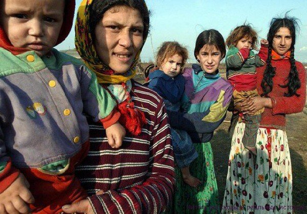 Вот подошел автобус, из него высыпали цыгане. Впереди шли пожилые цыган и цыганка, оба сияли золотыми зубами. У цыганки на груди были какие-то медали, пожалуй, мать-героиня, а позади них еще 7 молодых цыган, все они несли засаленные матрасы. Затем вышло десять молодых цыганок, и вылетела куча детей. Мужчины разошлись по станции, цыганки пошли гадать, а старые цыган с цыганкой сели на скамейку и стали за всем этим наблюдать.