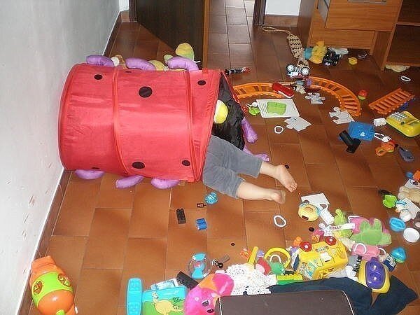 Любимым занятием моего ребёнка является перебирание (то есть раскидывание) своих игрушек да и вообще всего, что попадётся (ящик письменного стола, полка с посудными принадлежностями, банка с фасолью). Лично я не могу оставить всё это раскиданным дома перед тем, как мы идём на прогулку или собираемся укладываться на дневной сон. Поэтому, как только Саша собирался на прогулку или просился спать, я говорила: "Хорошо, только сначала соберём всё с пола, чтоб было чисто". Первое время он реагировал на это очень бурно, начинал истерить, что ему сразу же не подают то, чего он просит. Через пару месяцев, он соглашался подождать, похныкивая рядом и дёргая меня за руку с пелёнкой в руке (так он просится укладываться спать, принося мне свою пелёнку). Позже стал отвлекаться на другие дела, пока я всё убираю. А недавно, примерно в 1,7, когда я сказала снова, что сначала надо убрать игрушки, он присел рядом со мной и начал мне подавать то, что валялось под ногами, а несколько игрушек даже сам отнёс