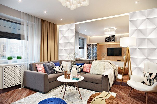 В лаконичном интерьере этой квартиры преобладает скандинавский стиль, который, бесспорно, располагает к себе современных жителей мегаполиса. Он излучает необыкновенную естественность, простоту и легкость. Скандинавская атмосфера — идеальный вариант для тех, кто в домашней обстановке, в первую очередь, ценит теплоту, уют и мягкость палитры. Представляем буквально только что завершенный проект арт-мастерской «Реплика» – квартиру на Киевской. По просьбе хозяев планировку трехкомнатной квартиры оставили без изменений. Прихожая Первое, что мы видим, попадая в этот уютный дом, это, конечно же, прихожая и длинный коридор с множеством дверей. Помещение выполнено в приглушенных тонах с преобладанием теплых оттенков. Из декоративных элементов здесь можно отметить контрастную стену с зигзагообразным рисунком и золотым зеркалом, а также пару картин с яркими графичными бриллиантами. Гостиная Самая первая дверь в коридоре ведет в семейную гостиную для отдыха и просмотра телевизора. Она обс