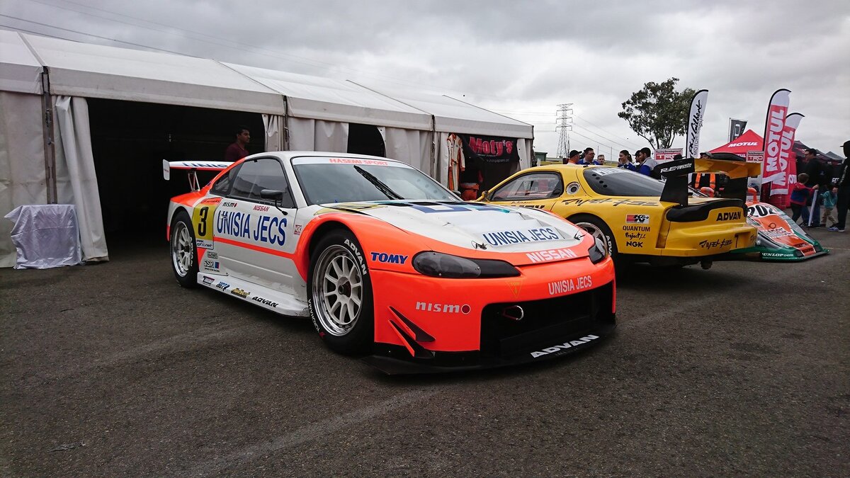 Nissan Silvia GT300 из японского турингового чемпионата JGTC. Такие машины строились на заводе подразделением Nismo, в основном на них выступали частные команды. Внутри эта Silvia и серийные S15 практически не имеют ничего общего. Данная Silvia GT300 после гонок в японском чемпионате попала в Норвегию, а уже оттуда была выкуплена без мотора и трансмиссии австралийцем, который начал готовить её к time attack. Под капотом побывало много моторов, в том числе и чудом найденный оригинальный для GT300 SR20DET подготовки Nismo объёмом 2.2 литра. Дейл, владелец Silvia, собирал разные конфигурации, в том числе и SR20VET с ГБЦ SR20VE, даже экспериментировал с выпускными клапанами уменьшенного(!) диаметра. В итоге двигатель с сухим картером под управлением Haltech Elite 2500 выдаёт порядка 500-600 сил (в зависимости от конфигурации и настройки). Утраченной оригинальной КПП GT300 нашли достойную замену — 6-ступенчатую секвентальную HGT. Картер сцепления, как и многое другое для этого автомоб