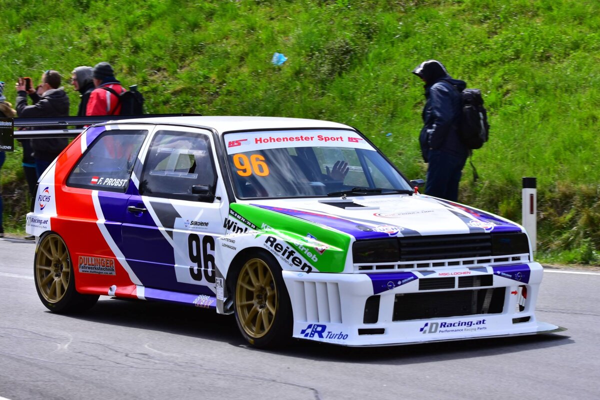 VW Golf Mk2 для подъёма на холм. Франц Пробст выступал в классе 1600 на атмосферном гольфе, но затем решил перейти на класс выше, чтобы конкурировать с двухлитровыми машинами. При этом он выбрал очень нестандартный путь. Двигатель построен на основе блока KR, объём 1.2 литра. ГБЦ от спортбайка Suzuki Hayabusa, специально адаптирована для блока VW. С турбонаддувом автомобиль как раз вписывается в класс 2000 и отлично конкурирует с двухлитровыми атмосферными машинами. — 376 л.с. при 11000 об/мин