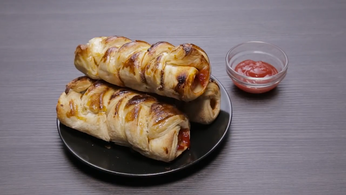 Нам понадобиться: Тесто, сосиски, кетчуп и горчица ( вместо горчицы можно использовать майонез или любой соус по вкусу) Сверху обмазываем яичным желтком (можно смазать сливочным маслом) выкладываем на противень, используйте бумагу для запекания если её нет можно использовать фольгу но тогда смажьте маслом и снизу. Запекаем в духовке 30 минут при 180 градусах. Приятного вам аппетита!