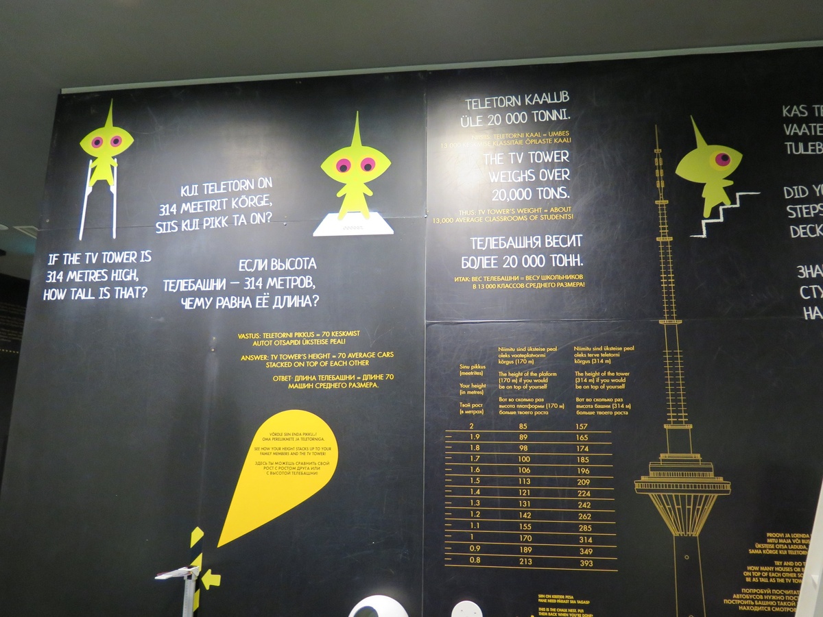 Таллиннская телебашня является самым высоким сооружением не только в Таллине, но и во всей Эстонии: ее высота составляет 314 метров. На первом этаже башни вас ждет не только сувенирный магазин, но и множество развлечений - мультимедийные установки, занимательная информация о башне, как ее строили, какое вещание она ведет, телестудия и все это выполнено в "космическом" дизайне. Вехи истории Символ башни Тут можно записать телеобращение на память