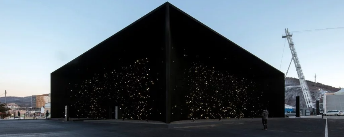Зачем? Хороший вопрос. Кому может понадобиться постройка, у которой стены поглощают свет на 99%... Автоконцерну Hyundai. Само здание построено в Южной Корее, в городе, который теперь известен всем, Пхёнчхан. Нельзя сказать, что здание получилось огромное, но величина это не главный его козырь. Высота стен 10 м, а длина 35 м. Вся суть в том, что вкупе с металлическими стержнями, выступающими из стен здание похоже на окно в космос. Благодаря непроницаемому мраку стен и свету "звезд", на них создается нужный эффект. Для покраски здания использовалась разработка Vantablack VBx 2. Изначальный принцип заключался в наращивании на объекте слоя вертикальных нанотрубок. Их размер в 3500 раз меньше человеческого волоса. Фотоны, находящиеся в потоке света, попадают на такую поверхность, теряются в подобной структуре, стесняются спросить дорогу и превращаются в тепло, так и не отразившись.