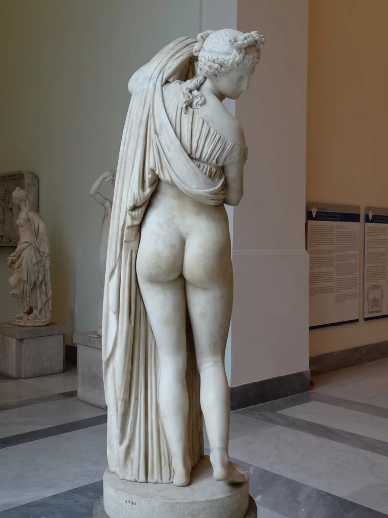 Венера Каллипига (прекраснозадая) – скульптура из мрамора (приблизительно 50-го года до нашей эры), изображающая богиню Афродиту, одетую в тунику, но с обнаженными ягодицами. Данный монумент считают копией утраченной греческой скульптуры, выполненной из бронзы. Произведение было найдено на развалинах Золотого дома римского императора Нерона в поврежденном состоянии (у него отсутствовали руки, голова и голень). Впоследствии гипсовая статуя неоднократно реставрировалась (в XVI столетии и капитально в конце XVII века знаменитым мастером Карло Альбачини). По некоторым данным, несохранившийся оригинал этой скульптуры украшал храм Афродиты в греческом городе Сиракузы. Что же касается римского аналога, то в свое время он находился в коллекции герцогов Фарнезе, а затем оказался в Национальном археологическом музее города Неаполь, где его можно увидеть и по сей день. Одна из современных копий Венеры Каллипиги находится в России – бронзовый монумент ярко-золотого цвета является частью композици