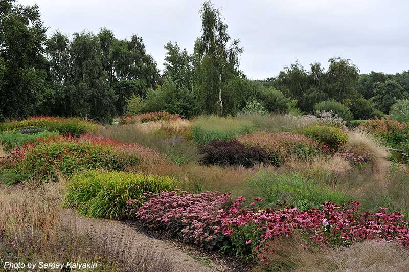 В книге Gardening with grasses Майкла Кинга и Пита Удольфа в самых общих чертах, без указания видов, приводятся примеры хороших комбинаций декоративных злаков с другими многолетниками. Процитирую их в этом блоге и проиллюстрирую злаки фотографиями, в основном из садов Удольфа. Вейник (видимо, имеется в виду Calamagrostis x acutiflora Karl Foerster)
