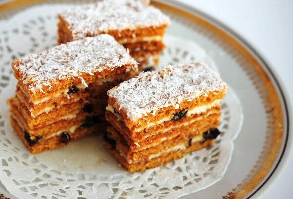 Медовик с черносливом – еще один рецепт этой невообразимой вкусности – торта с медом. Вообще, сколько хозяек – столько и рецептов медовиков, медяников, медовых пирогов и т. д. Главное – все они готовятся из теста с добавлением меда. У меня самой в запасе несколько рецептов медовика. Можно сделать тесто несколько иначе, не варить его, оно получается более жидким и лепешки получаются заливные. Данный рецепт – это более длительный процесс, лепешки нужно тоненько раскатывать, но, поверьте, результат стоит усилий. Торт, похожий на этот, подают в «Кондитерской» возле моего дома. Я даже ходила туда на разведку, чтобы понять, что и как они делают. Как оказалось, мой рецепт очень близок к тому, что у них, по крайней мере, по моим вкусовым ощущениям :-). Правда лепешек я сделала многовато, поэтому из одной, которая осталась, я потом сделала рулет, но это уже будет история для другого поста. Не буду мучить вас подробностями и байками, а лучше перейдем к рецепту – буду печь такой на этой неделе. П
