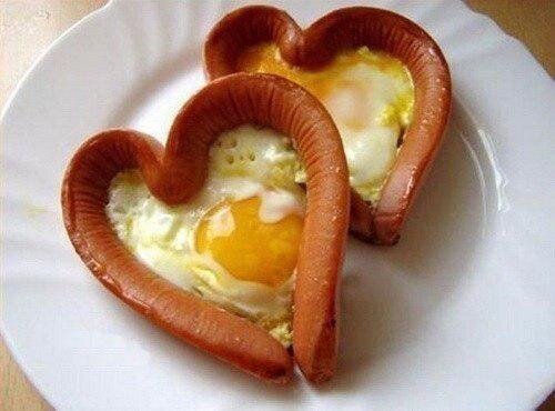 Ингредиенты: - длинные сосиски - мелкие яйца (можно даже перепелиные) - соль - зелень для украшения (у меня лист салата) - растительное масло для жарки Приготовление: Для этого блюда подходят высококачественные длинные сосиски. Их нужно сварить. Варить сосиски нужно не долго, чтобы они не успели разбухнуть и не потеряли форму. Но, варить сосиски нужно обязательно, такой уж это продукт. Взять одну сосиску и разрезать вдоль на две части, но не дорезать до конца около одного сантиметра. Как показано на фото. Половинки сосиски вывернуть на изнанку, сформировать сердце и закрепить его с помощью деревянной зубочистки. Сделать необходимое количество сердец. Взять сковороду с плоским дном, налить растительное масло и разогреть на среднем огне, ближе к слабому. Обжарить сердца из сосисок с одной стороны. Перевернуть, можно ещё немного убавить огонь. Сразу как перевернули сердца. Внутрь сосисок – сердец разбить яйца. Получится толстый слой яйца внутри сосиски. Вот тут-то и пригодится мале