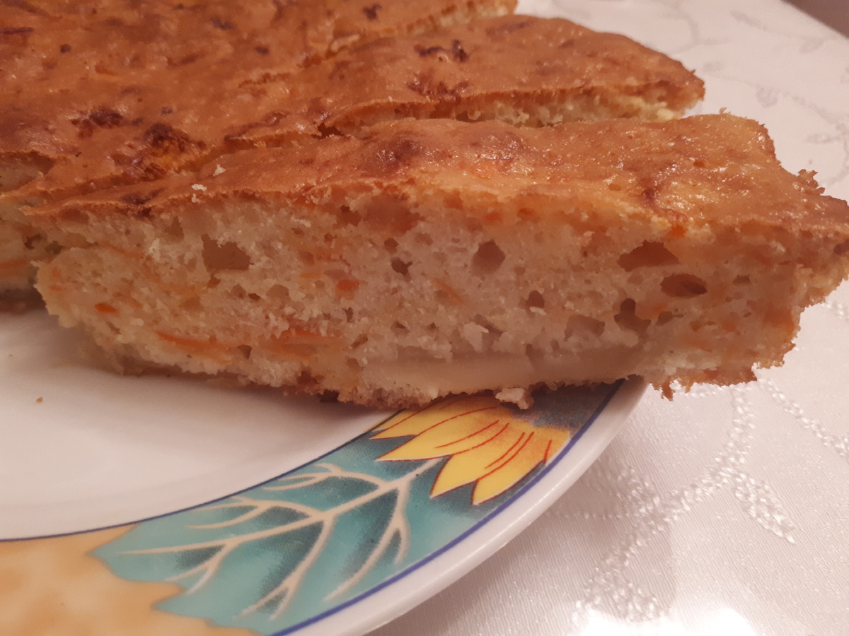 Хочу поделиться рецептом пирога, который приготовил мой муж!!! Надо сказать, что он не из тех мужчин, которые готовят, но он любитель всего сладкого и печеного. Обычно я пеку вкусности по выходным дням, но сегодня приболела и не в состояние была заниматься приготовлением пищи. А так как муж привык ко всяким пирогам, то решил поэксперементировать. В помощники взял нашу маленькую дочку, она натерла цедру на безопасной терке))). Название пирога не знаю, так как он готовил из того, что было в холодильнике. Получился пирог, неожиданно для меня, ооооочень вкусный! Ингредиенты: 4 яйца; 1 ст. сахара; 50 гр.сливочного масла; 6 ст.ложек муки; 1 большая морковь; 1 большое яблоко; Цедру с 1 апельсина; 0,5 ч. ложки соды гашеной уксусом. Приготовление: 1. Яйца смешать с сахаром, взбить венчиком. 2. Затем добавить муку, масло растопленное и хорошенько перемешать. 3. Морковку почистить и потереть на крупной терке. Тертую морковь добавить в тесто. 4. С 1 апельсина натереть цедру на мелкой терке и