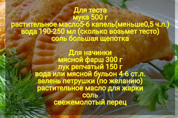 Здравствуйте, сегодня расскажу Вам очень вкусный рецепт чебуреков! Этот рецепт я пробовала в Крыму и там мне сказали что только они готовят такие вкусные чебуреки. В принципе сами попробуйте и оцените обязательно! Тесто очень хрустящее и вкусное, а начинка очень сочная!!! Ингредиенты: Способ приготовления: 1. Для начала в глубокой тарелке просеем муку и насыплем щепоточку соли. 2. Добавить капель 6 масла и тщательно размять в муке. 3. В муку добавим воды и будем замешивать тесто, чтобы оно стало тугим. 4. Дать готовому тесту отдохнуть около часа. 5. Будем готовить начинку, фарш смешаем с мелко порезанным луком. 6. Добавим соль,перец и порезанную зелень. 7. В получившийся фарш добавим бульон и хорошенько перемешаем. 8. Раскатать уже отдохнувшее тесто тоненько и на одну сторону выложить фарш. 9. Соединить рая и придавить вилкой. В большом количестве масла обжарим получившиеся чебуреки, хорошенько с двух сторон. Приятного аппетита!!!! Угощайте друзей, Родных и Б