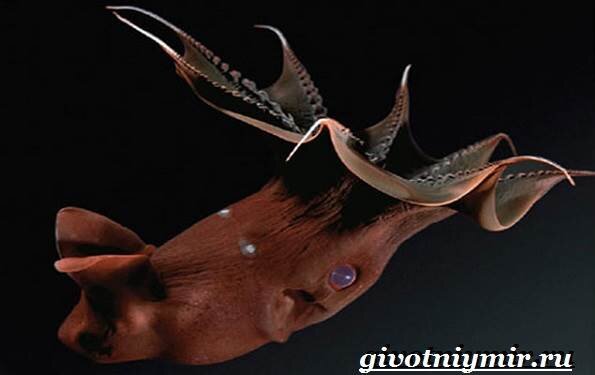 Его щупальца соединены перепонкой, что внешне напоминает плащ, беспозвоночное имеет буро-красный цвет, и живет в темных глубинах.