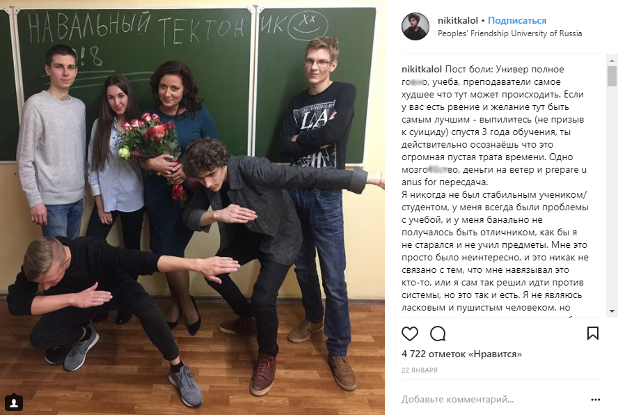 Известный московский видеоблогер Никита Лол был отчислен из РУДН, о чем сообщил в своём профиле в Instagram. Причиной отчисления послужила публикация в Instargram, где Никита, используя ненормативную лексику по отношению к преподавателям ВУЗа, описывает все "прелести" обучения в университете. "А пока, я медленно и верно сдаю те предметы, на которые мне было глубоко [все равно] из-за преподавателей [дураков], уважения к которым у меня никогда не будет", — пишет блогер в своей публикации. Несмотря на недопустимое поведение медийной персоны в интернете, многие подписчики поддержали блогера, написав слова поддержки и сочувствия под "роковым" постом. Напомним, что видеоблогер прославился благодаря трансляции в некогда популярном приложении Periscope, где тот справлял нужду, снимая процесс на камеру своего смартфона.