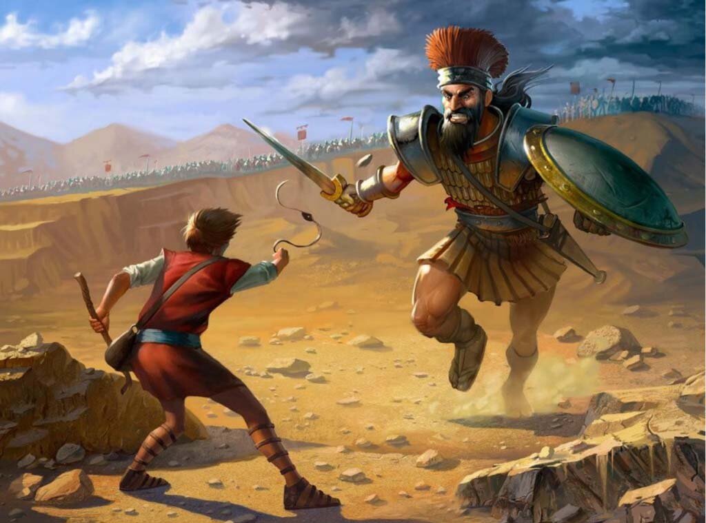 Маленькие израильтяне любят сказки так же, как дети всего мира. Но каждую субботу родители читают им вслух главу из Библии, похожую на сказку. Про Вавилонское столпотворение, описанное в Библии, мы уже упоминали, а сейчас перескажем легенду, которая объясняет часто употребляемое выражение «победил, как Давид Голиафа». Филистимляне начали войну против Израиля. Две армии стояли на холмах друг напротив друга, а в долине должны были единоборствовать воины-силачи. Ежедневно в долину спускался закованный в доспехи филистимлянский великан Голиаф, вооружённый громадным мечом и длинным копьём. Сорок дней Голиаф смеялся над войском, в котором не находилось ни одного храбреца для поединка. Царь Саул и его полководцы спрятались от стыда в шатрах и обещали тому, кто решится на бой с Голиафом, несметные богатства, освобождение от налогов и руку царской дочери. Израильтянский пастушок Давид был ещё слишком юн, чтобы его взяли в войско. Он носил еду в лагерь своим старшим братьям. Однажды он при