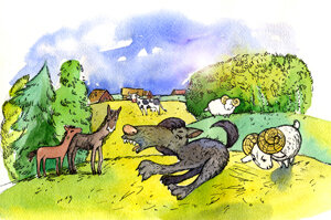 Португальская народная сказка Жил в лесу волк. Проснулся он как-то утром, потянулся и трижды чихнул. «Неплохо! Значит, сегодня мне три раза повезёт», — подумал волк. Вдруг видит — на холме два барана бодаются. «Вот и первая удача! Да ещё какая!» — обрадовался волк. Подкрался он к баранам да как крикнет: — Что за беспорядок! Что за беззаконие?! Сейчас я вас накажу… Видят бараны, что бежать им некуда, и говорят: — Сеньор волк, мы знаем, что провинились и вы нас за это съедите. Но сделайте милость, прежде рассудите нас. — А что такое? — спрашивает волк. — Поспорили мы с товарищем: я говорю, что это — луг моего хозяина, а он говорит — нет, здесь владения его хозяина. Не можете ли вы рассудить нас? Согласился волк. Уставился в землю и давай прикидывать, ровно ли прочерчена граница. И вдруг как поддадут ему сзади! Упал волк и лишился чувств. Бараны-то мастера бодаться! Пришёл в себя несчастный волк, поднялся охая и пошёл дальше. «Ну, — думает, — если и другие две удачи будут такими, я до