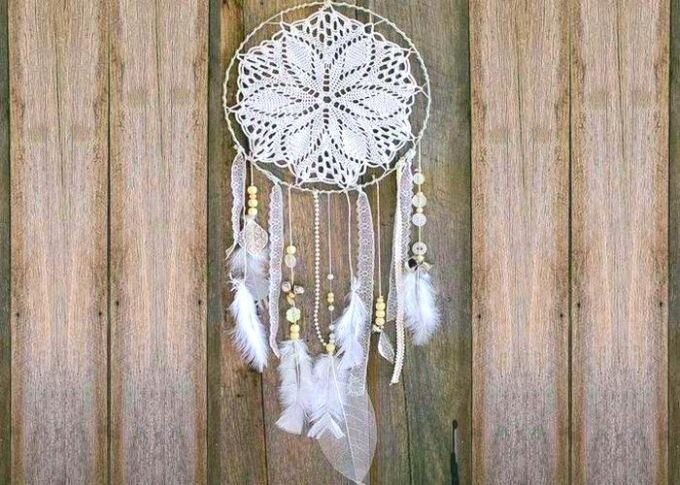 Не имеет значения, верите вы или нет в силу "ловца снов", но стоит сделать такую вещь, поскольку она прекрасно украсит интерьер практически любого стиля - от наполненного милыми мелочами винтажного до холодного хай-тек. Для начала хочется отметить, что такой способ сделать ловца снов - прекрасный вариант использовать надоевшую ажурную салфетку. Итак, для поделки вам понадобится: круглая или многоугольная (чем больше углов, тем лучше!) ажурная салфетка, нитки в цвет, жесткая проволока, перышки, бусинки, бисер, маленькие узорчатые пуговки, узкое кружево. Полезный совет: для этой поделки совершенно не обязательно покупать бусины, пуговицы и бисер. Это именно тот случай, когда очень уместно будет смотреться микс бусин, оставшихся от рассыпавшихся колье. Процесс работы над поделкой: 1. Из проволоки сделайте кольцо, концы проволоки зафиксируйте, скрутив их. Радиус кольца должен быть чуть больше радиуса салфетки. 2. Хлопчатобумажной ниткой закрепите салфетку внутри кольца, как показано на ф