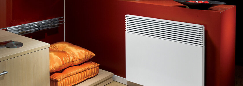 В основе конвектора – нагревательный элемент (ТЭН) трубчатого, игольчатого или монолитного типа, расположенный в нижней части алюминиевого или стального корпуса. Несмотря на то, что сам ТЭН может раскаляться и выше 100⁰ С, максимальная температура корпуса 60⁰С – горячо, но ожогами не грозит. Такая особенность значительно расширяет сферу применения: даже стены из бруса или бревна – не препятствие для монтажа обогревателя. Настройка прибора и управление осуществляется посредством механического регулятора или электронного дисплея, механический вариант менее надежен, но дешевле, электроника дороже, но совершеннее.