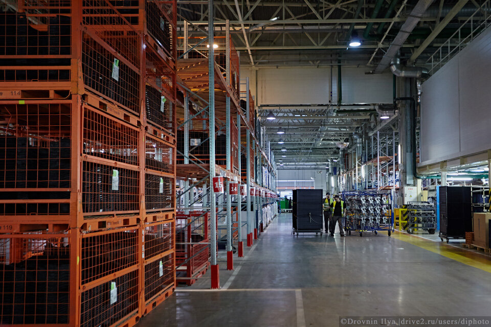 Искры из под аппарата - робот варит кузов, по цеху едет электро-тележка с набором деталей на автопилоте! Я нахожусь в «сборочном городке» среди роботов, людей, машин и даже целых перекрестков с дорогами! Сегодня экскурс по заводу, где налажено производство автомобилей Nissan по полному циклу. Если театр начинается с вешалки, то завод со спецодежды и склада комплектующих. На стеллажах хранятся тысячи деталей для сборки. Потом все это из этих коробочек превратится в автомобиль. По цехам детали ездят на робото-тележках с автопилотом. Сами знают, что куда привезти, увезти и в какое время. Хоть и маленькие, а утащит 1,5 тонны. Очень необычно видеть, что что-то едет само по себе без водителя. Есть и с водителем электровозы. Новые бамперы поехали на сборку. Их производят тоже здесь, в цехе пластиковых деталей. Часть деталей уезжает на склад для европейских заводов. Двигатель и коробки приходят в сборе, дальше они отправляются на линию подсборки, потом на свадьбу. Так называются п