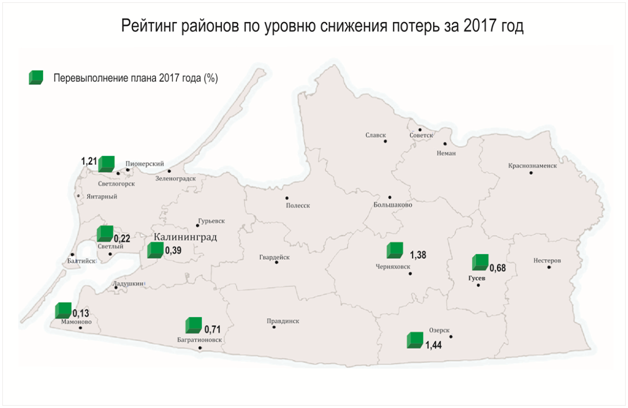 Согласно статистике, за указанный период компания отпустила потребителям по всей Калининградской области более четырех млрд киловатт-часов (кВтч) энергии, потеряв при этом 646,6 млн киловатт-часов. По сравнению с 2016 годом доля потерь электричества в сетевой компании сократилась на полтора процента. Снижение уровня потерь — ключевой показатель эффективности деятельности сетевой компании. Энергетики делят потери на технологические и коммерческие. Последние – это хищение электроэнергии, прокомментировали собкору в Калининграде сегодня, 13 февраля 2018 года, в управлении АО "Янтарьэнерго". Доля потерь энергии в структурных подразделениях «Янтарьэнерго» разная. В восьми районах электрических сетей (РЭС) план 2017 года по снижению потерь энергоресурса перевыполнен (см. инфографику). Лидер – Озерский РЭС (перевыполнение на 1,44 %). За ним следует Черняховский РЭС (1,38 %), замыкает тройку лидеров Светлогорский РЭС (1,21 %). Четвертое место – у Багратионовского РЭС (0,71 %), пятое – у Гусев
