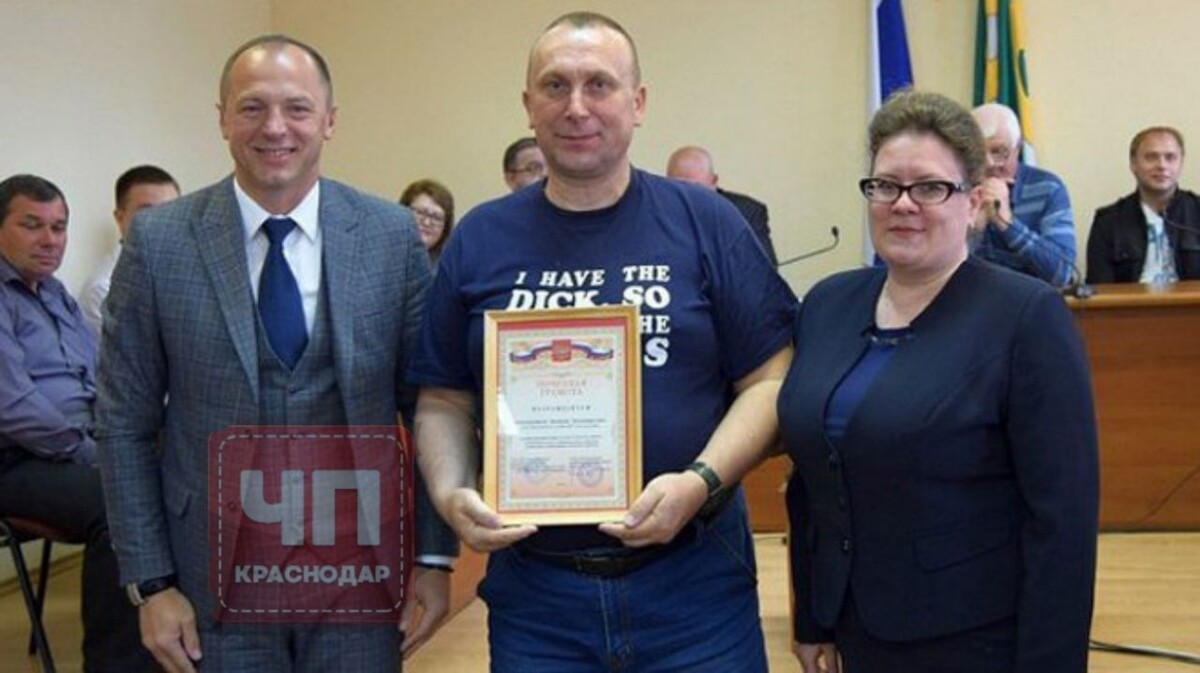 Казачий атаман Узловского станичного казачьего общества Валерий Константинов вышел получать награду в неприличной футболке. На ней написан отрывок из песни Rammstein — Pussy. Об этом сообщают местные СМИ.