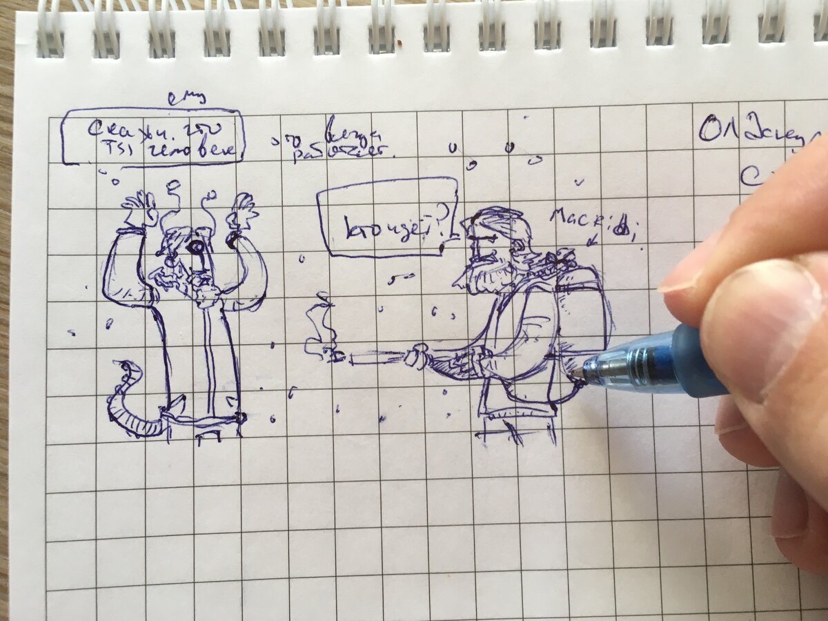 Кратенько поведаю о том какие обычно этапы я прохожу, когда работаю над иллюстрацией. Про идеи не буду, это отдельная тема, буду только про технические моменты. Всё делается в 3 этапа: 1. Набросок на бумаге Раньше я рисовал на листах А4. Это были и белые и желтые листы, кстати, желтые мне особо нравились и чем плотнее тем лучше. В плане выбора бумаги я вообще настоящая истеричка. В большинстве случаев мне не нравится фактура и плотность. Раньше месяцами мог ходить по магазинам и покупать себе бумагу тратя на это кучу денег. При этом безумно расстраиваясь, если бумага оказывается совсем не такой, которую я хотел. Так же было и с карандашами. Переломал их в порыве гнева целую тонну)) Сейчас всё проще. Я рисую в блокнотах в клеточку и шариковой ручкой. Раньше из ручек предпочитал обычные Stabilo, сейчас автоматические с тонкой головкой и толстым корпусом и обязательно с резинкой за которую удобно ручку держать. С тетрадками не все так просто: люблю на спирали и также тщательно выбираю бу